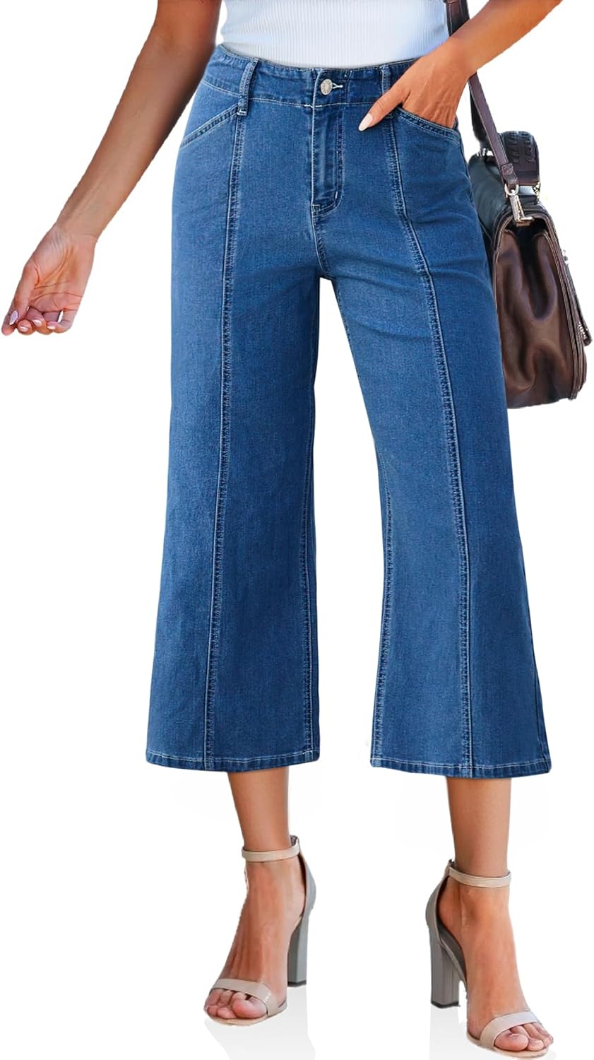 Tankaneo Womens Cropped Wide Leg Capri Jeans Baggy High Waisted Stretchy Flare Jeans Front Seam Denim Pants with Pockets