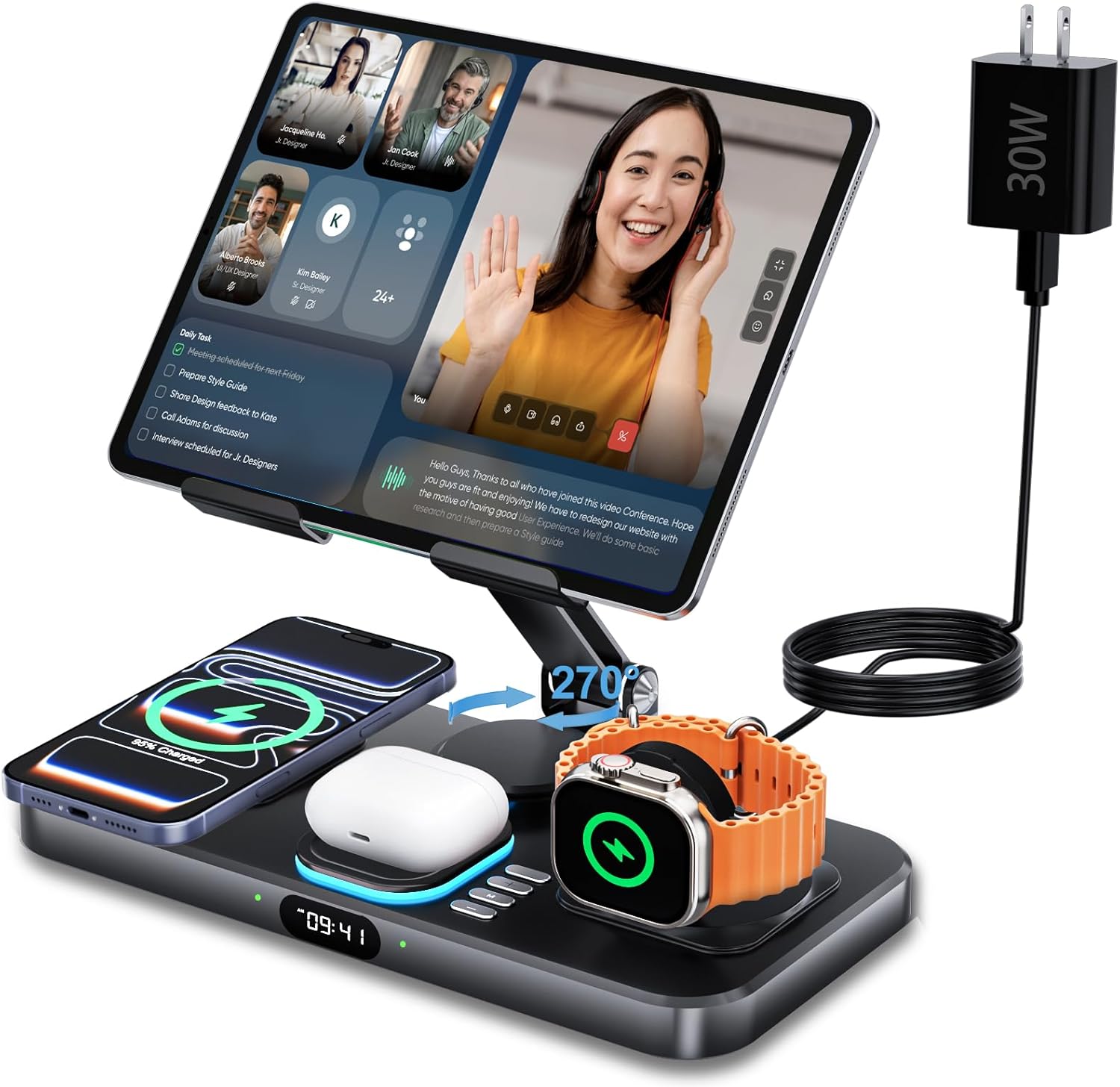 30W Foldable Charging Station for Multiple Devices, iPad Charging Station with Clock Display & Night Light for iPhone 17 Pro Max/16/15/iWatch 11/Air-pods 3/iPad 2025/Tablet Stand Holder
