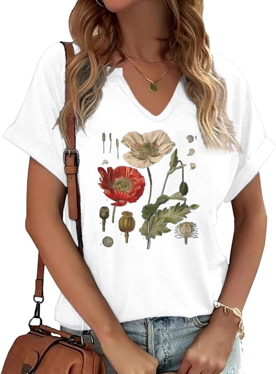 Vintage Flowers V Neck Shirt for Women Boho Floral Wildflowers Graphic Tee Casual Cottagecore Summer T Shirt