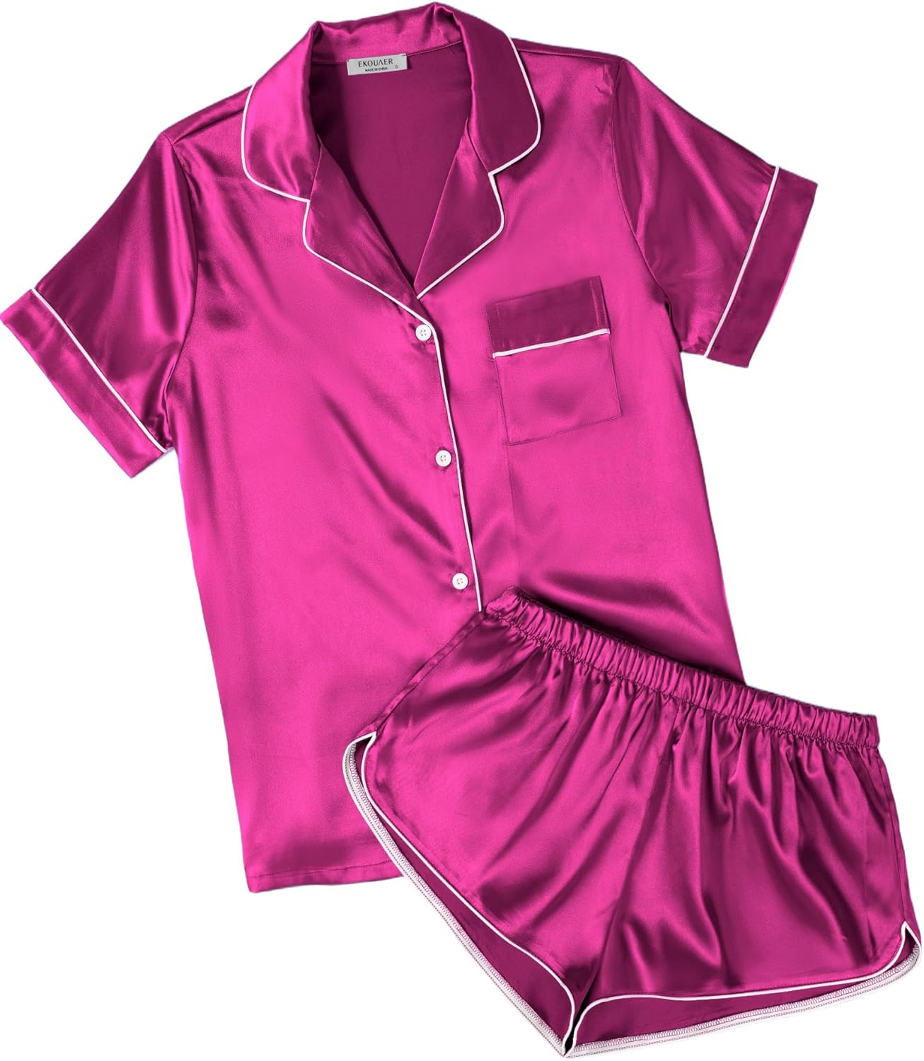 Ekouaer Womens Silk Satin Pajamas Short Sleeve PJS Shorts Set Soft Button Down Sleepwear 2 Piece Loungewear S-5XL