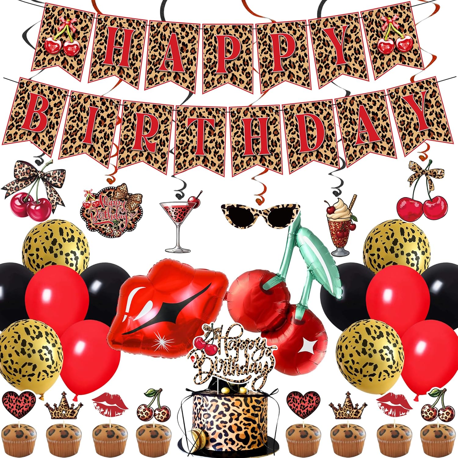 Holkcog Cheetah and Cherry Birthday Decorations, Leopard Happy Birthday Banner, Red Black and Cheetah Print Balloons, Cherry cupcake topper, red Leopard pattern party supply for Girls Women