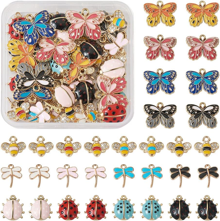 64pcs Enamel Bee Charms Light Gold Ladybird Butterfly Charms Dragonfly Pendants Insect Dangle Charm for Jewelry Making Necklaces Bangles Bracelets Earrings DIY Crafts Alloy Enamel Pendants