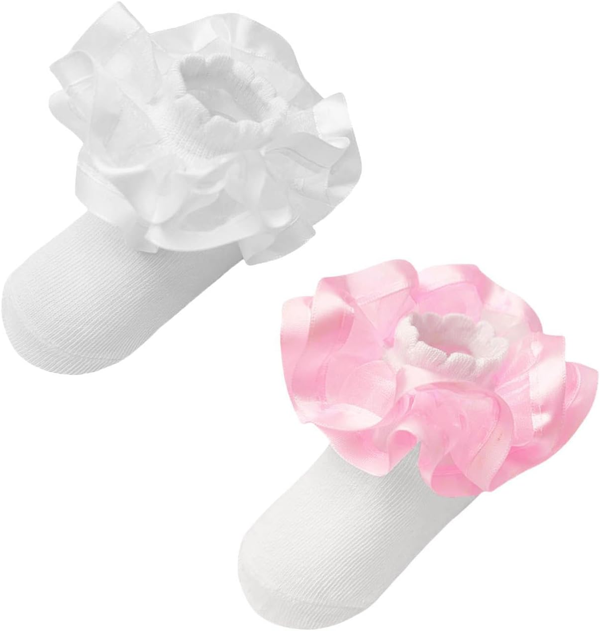 2 Pairs Girls Ruffle Lace Cotton Socks,Cute Double Big Lace White Frilly Princess Dress Socks for Toddler Little Girls