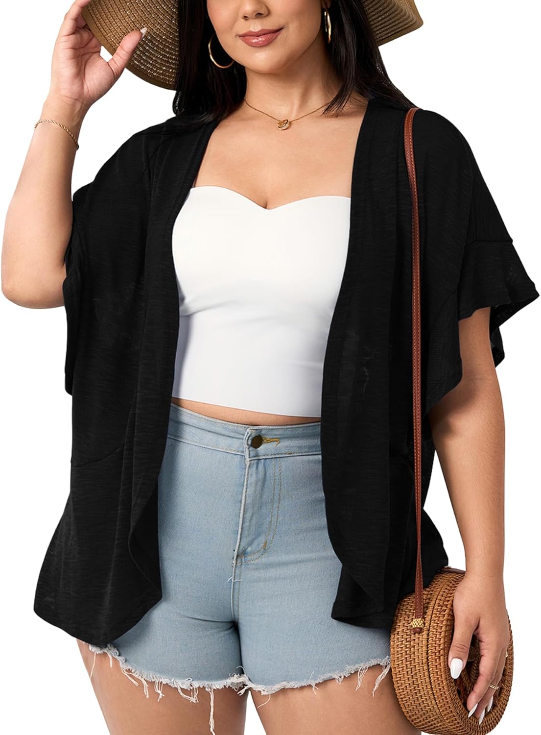 SCOMCHIC Women Plus Size Lightweight Cardigan Summer Kimono Ruffle Short Sleeve Open Front Casual Tops Beach Cover Up