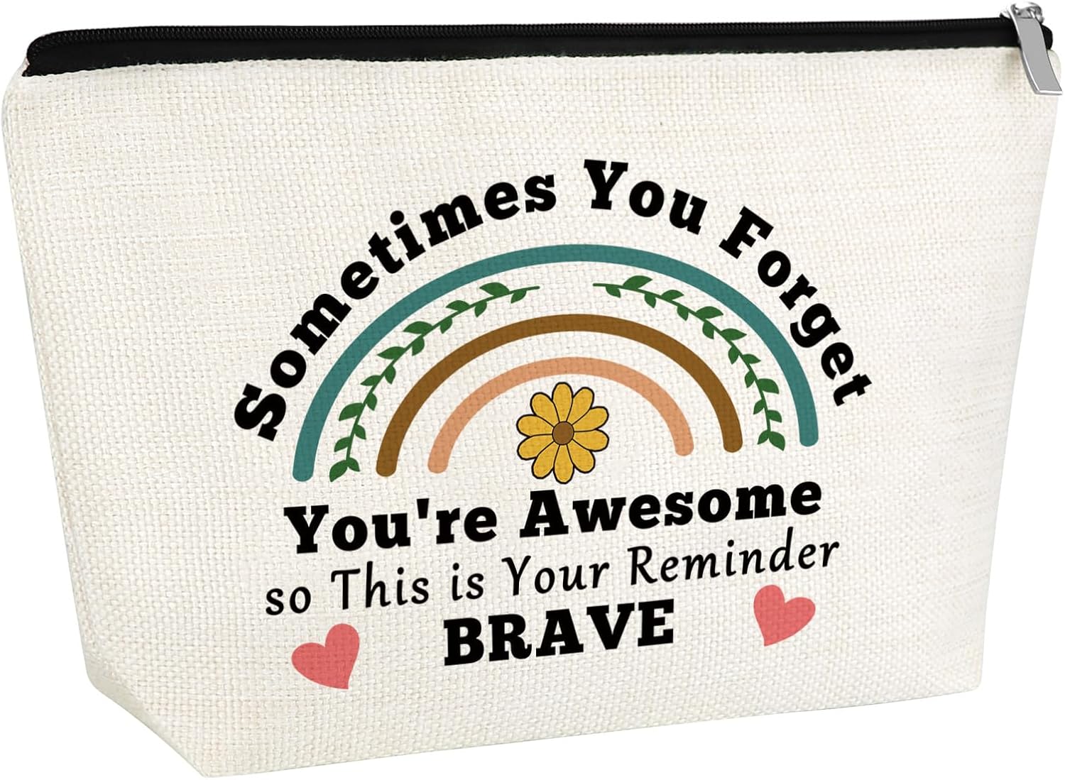 - Inspirational Gifts for Women:Brave makeup bag for your daughter to enjoy their new school life and be optimism.Printed with motivational messages "sometimes you forget you are awesome so this is your reminder",this off to college gift may bring strength and courage to him/her when going to college. A little reminder to keep pushing forward even on the hardest days.Cool gifts for college students who will feel anxious or sad at school,it will inspire and keep them full of courage and be brave.