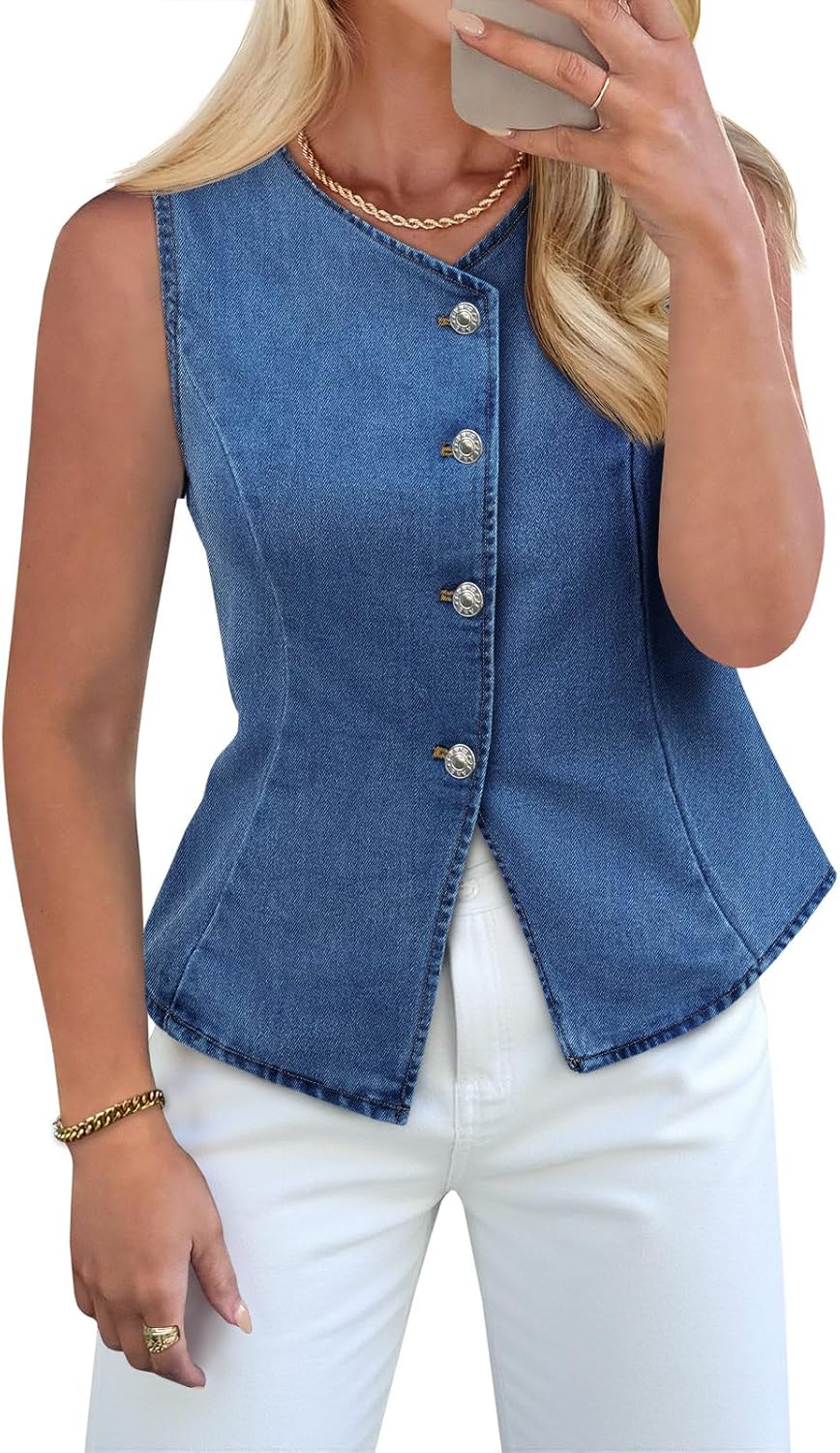 Tankaneo Womens Button Down Denim Vests Tops Sleeveless Fitted Jean Tank Tops Y2k Trendy Casual Waistcoat