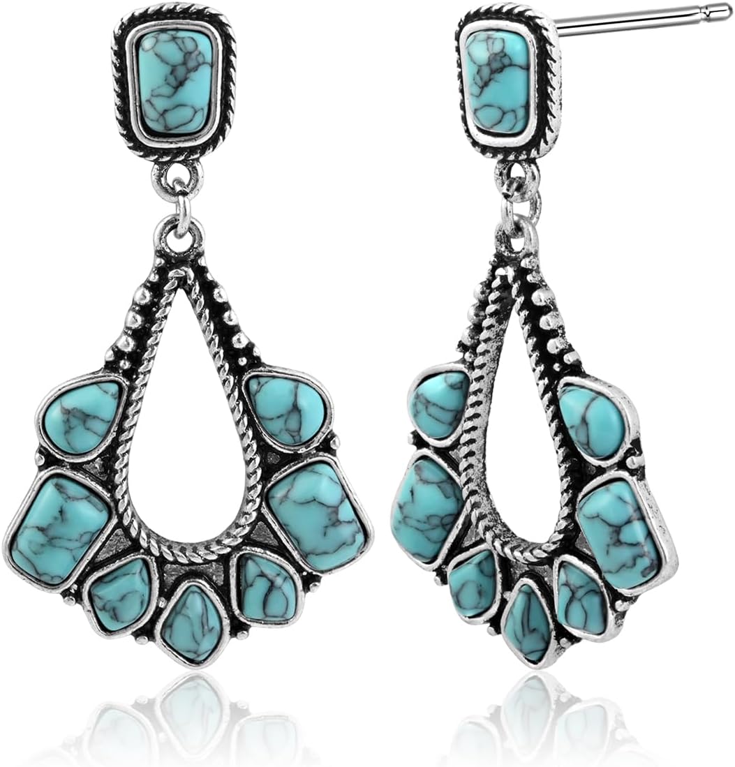 Silver and Turquoise Large Big Dangle Stone Blue Earrings Western Bohemian Vintage Earrings for Women Dangling
