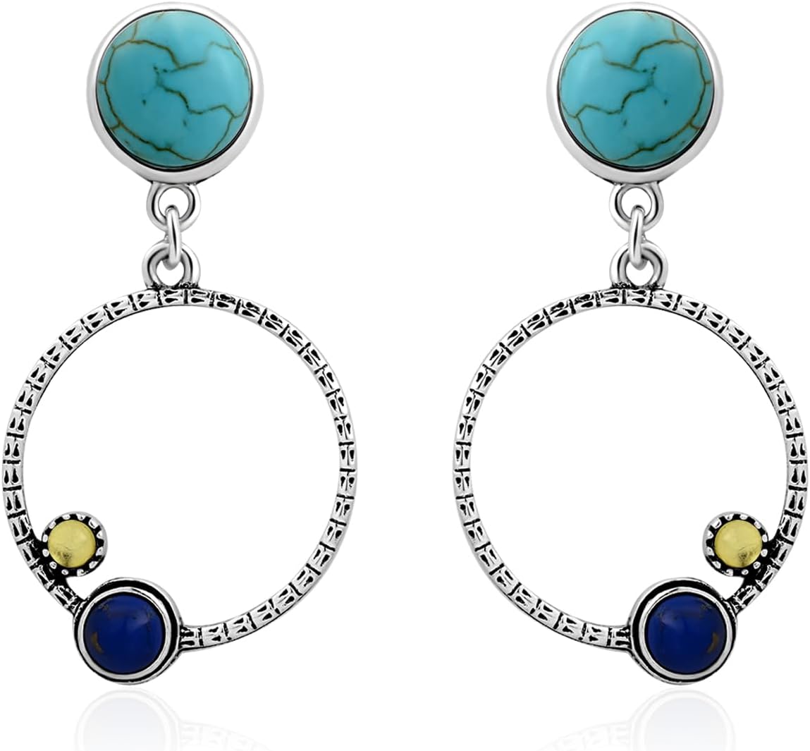 Silver and Blue Boho Turquoise Circle Sapphire Round Dangle Stud Vintage Drop Earrings for Women