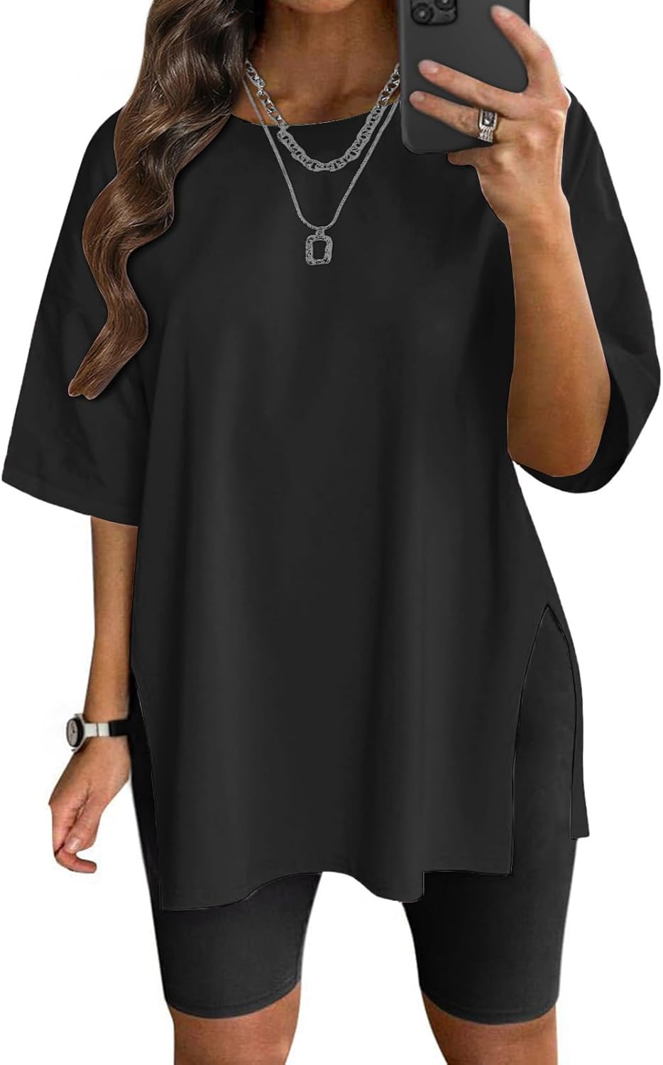 VNIRA Plus Size T Shirt for Women Oversized Cotton Short Sleeve Workout Top Loose Fit Side Split Casual Basic Tunic Top