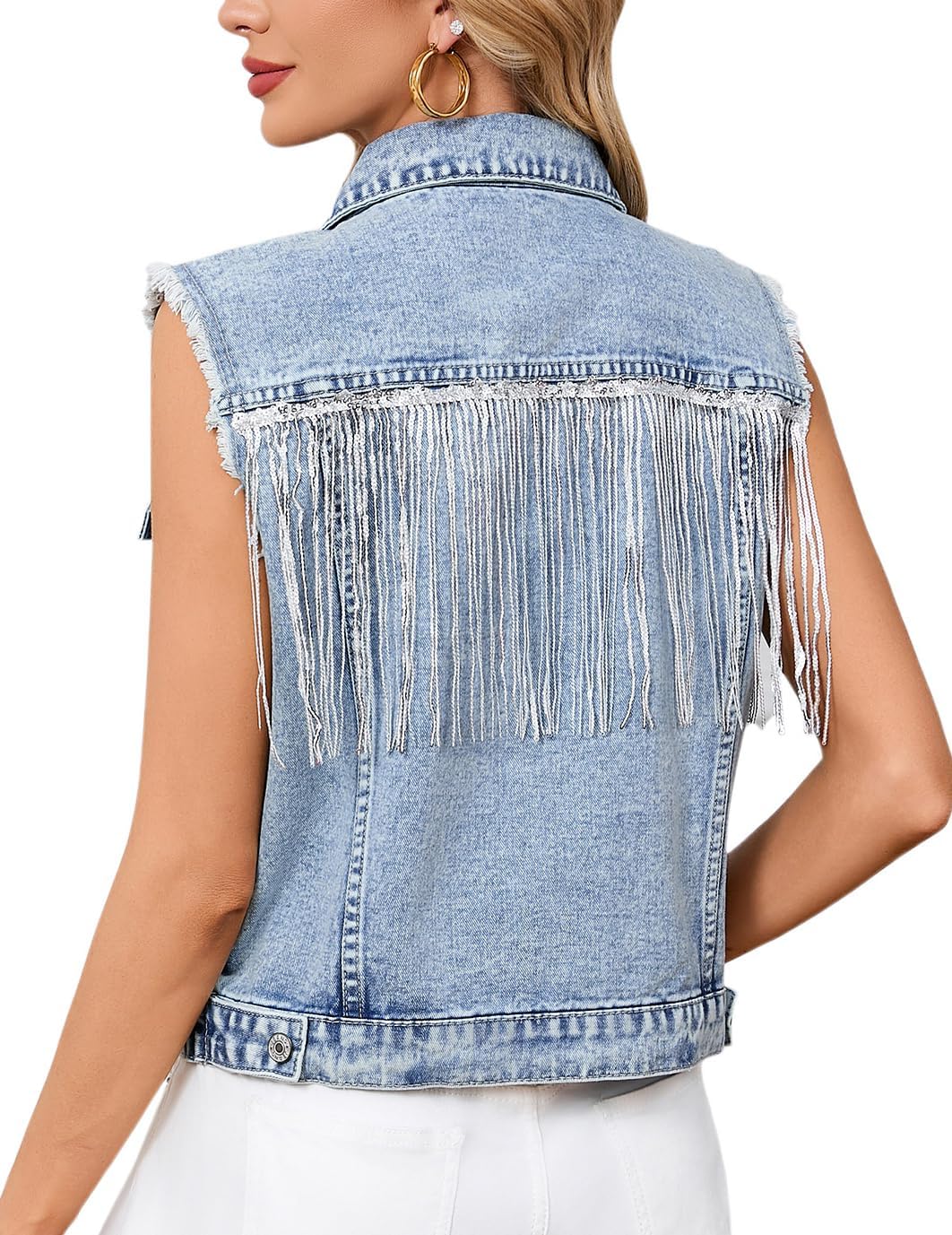 Womens Frayed Denim Vest Top Button Down Pearls Beading Sequin Fringe Jean Vest Western Sleeveless Waistcoat