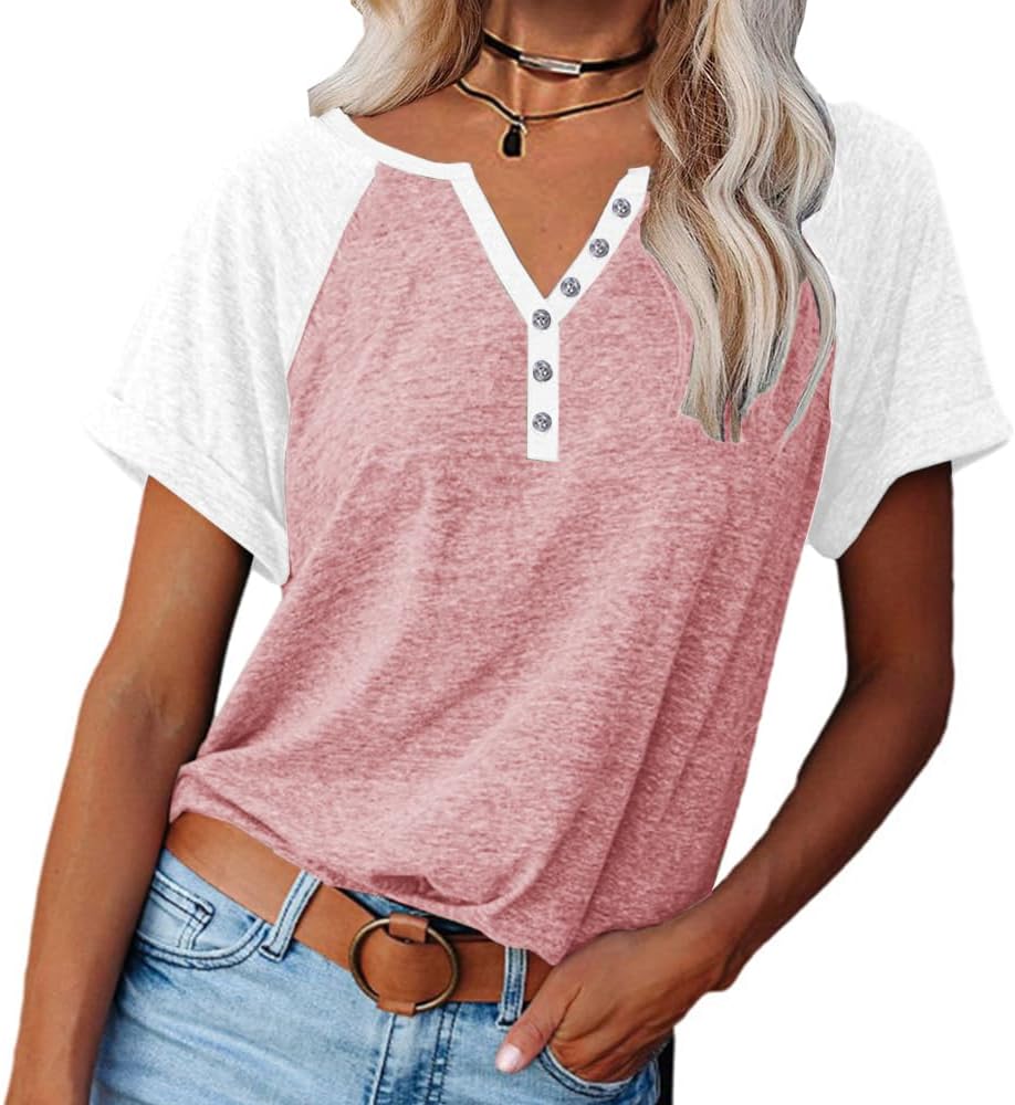 Womens Shirts Summer Henley V Neck Color Block Tshirts Raglan Short Sleeve Casaul Trendy Tops