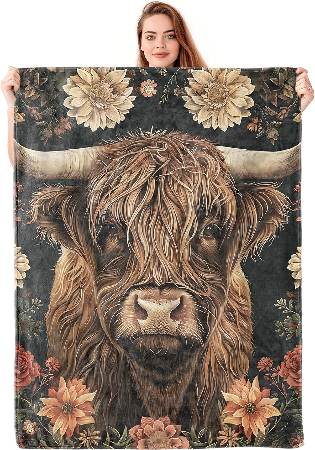 Highland Cow Floral Fleece Blanket Gifts for Kids Girls, Rustic Farm Animal Throw Blankets for Women Adults, Cozy Lightweight for Couch Bed Room Home Decor, 50x60 in