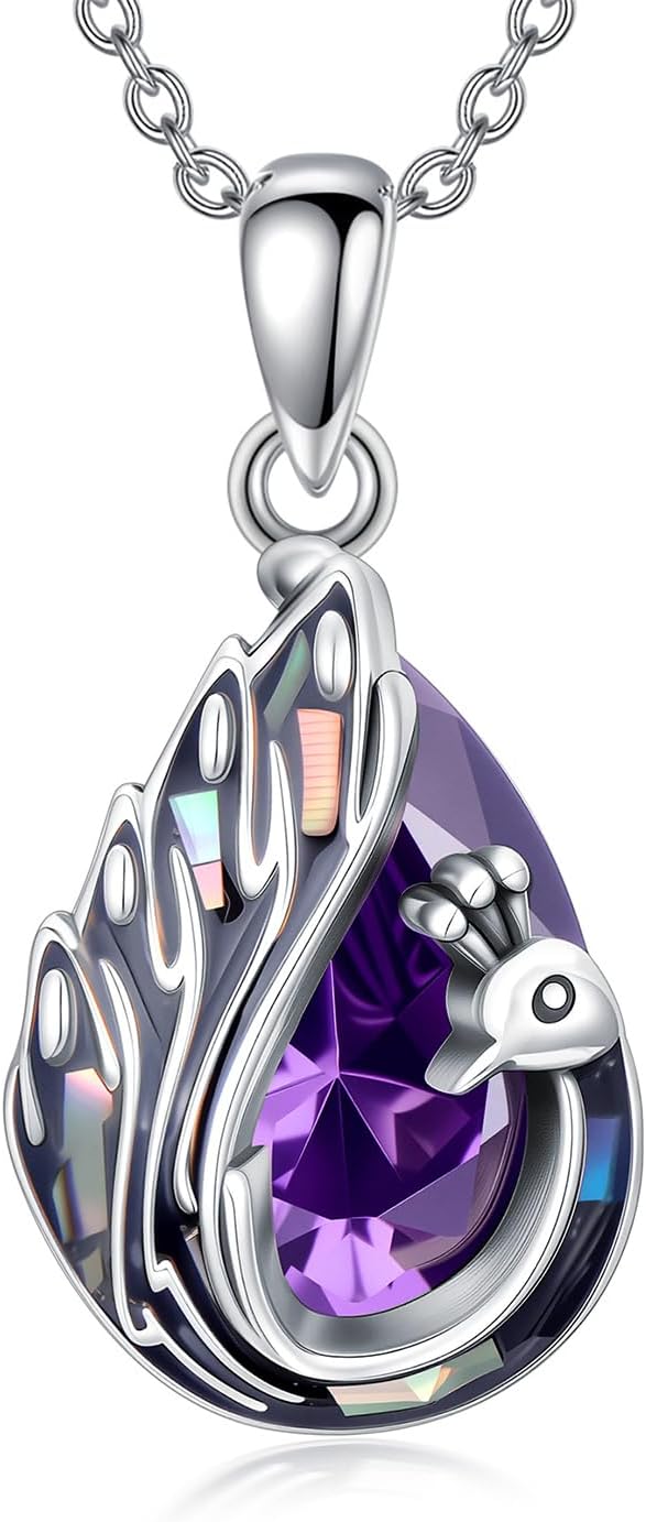 Peacock Necklace 925 Sterling Silver Peacock with Purple Amethyst Pendant Necklace for Women