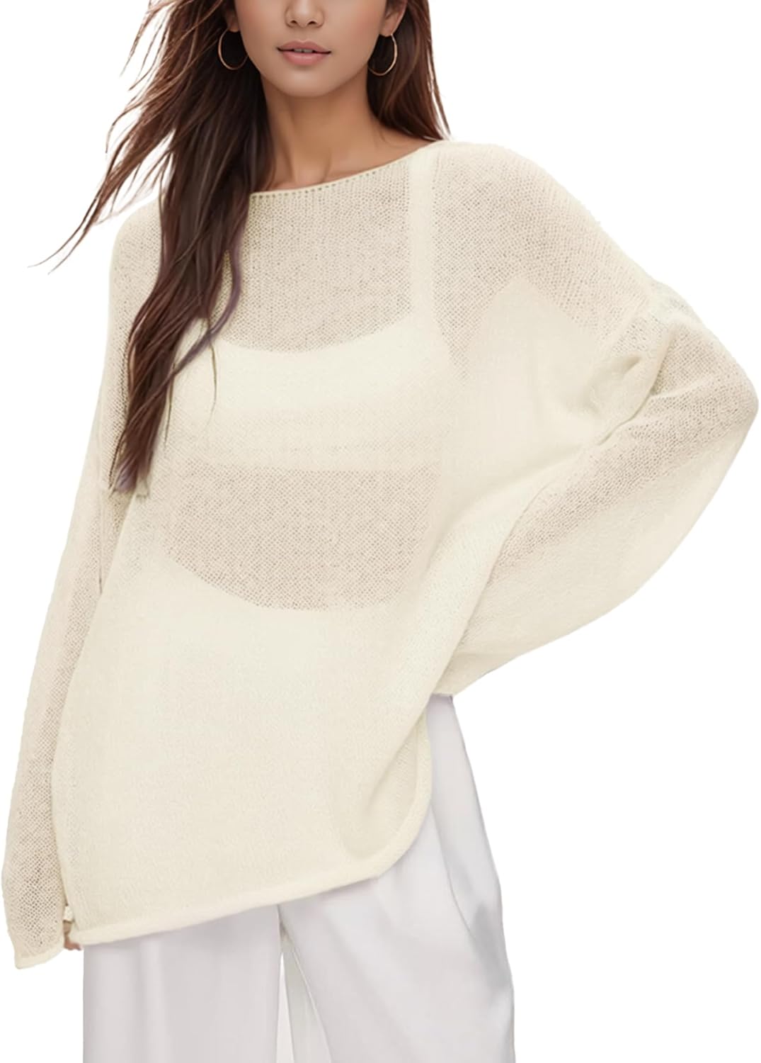 Women's Oversized Sheer Mesh Knit Sweater, Bell Long Sleeve Hollow Out Pullover Tops Trendy Casual Outfits