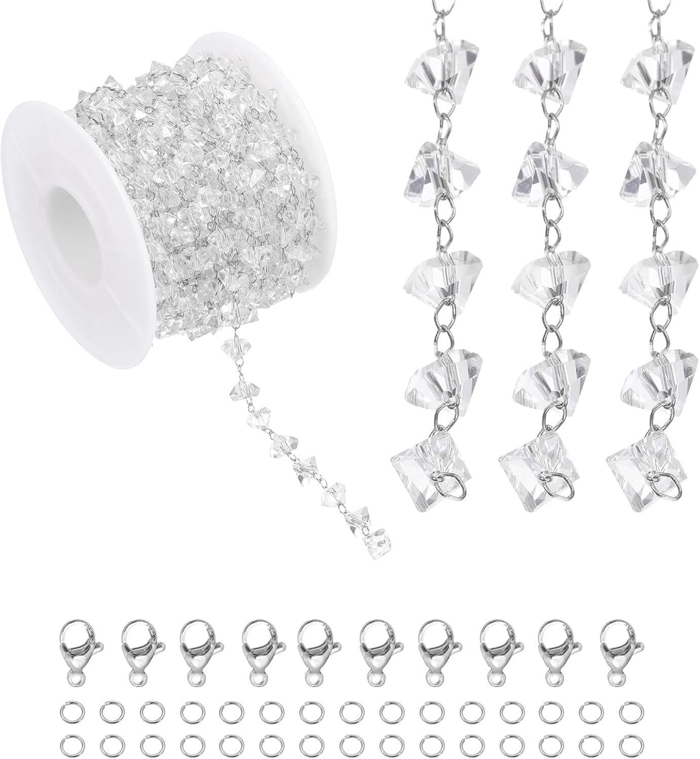 - Specification: Material: Copper; Color: White; Chain Length: 5m/16.4ft; Lobster Claps Length: 10mm/0.39inch; Jump Rings Diameter:5mm/0.2inch; Package List: 1 Roll x Faceted Triangle Crystal Chain Roll,10Pcs x Lobster Claps ,30Pcs x Jump Rings