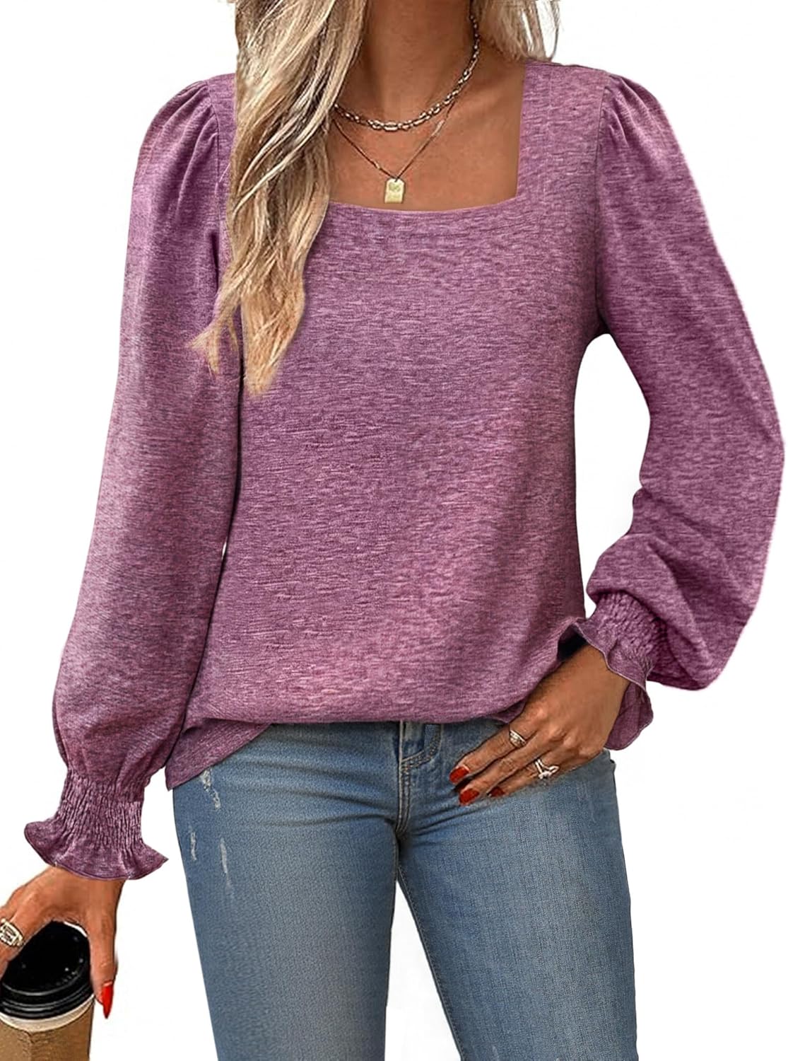 Women's Puff Sleeve Square Neck Shirt Loose Fit Casual Top Long Sleeve Blouse for Fall Winter