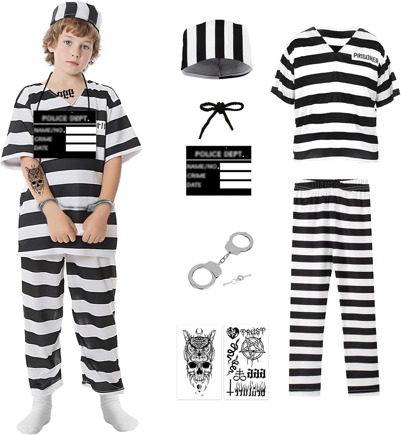 Prisoner Costume Kids 7Pcs Classic Striped Jail Inmate Costume Halloween Outfits Convict Cosplay Props