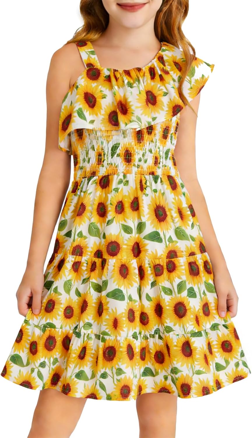 Haloumoning Girls Floral Dress Kids One Shoulder Ruffle Trim Summer Boho Holiday Dress 5-14 Years