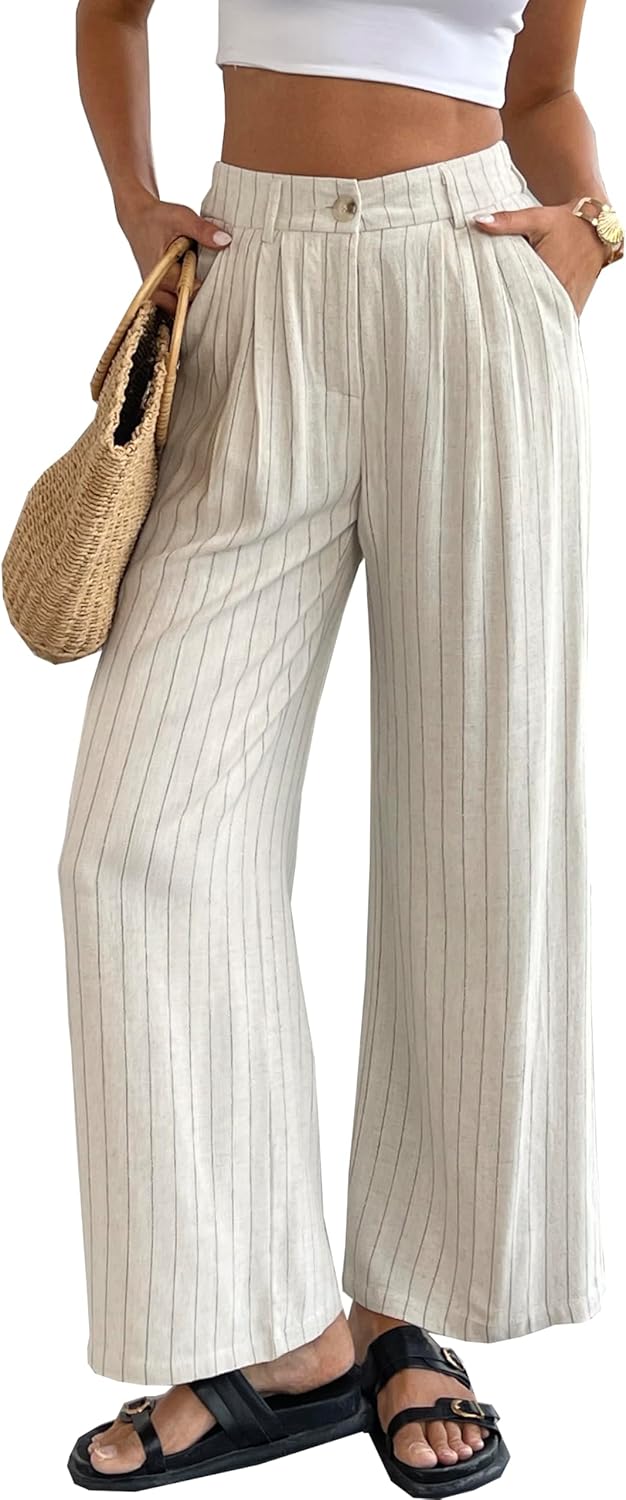 heipeiwa Women's Linen Pants Striped Culottes Summer Wide Leg Trouser Dress Casual Capris