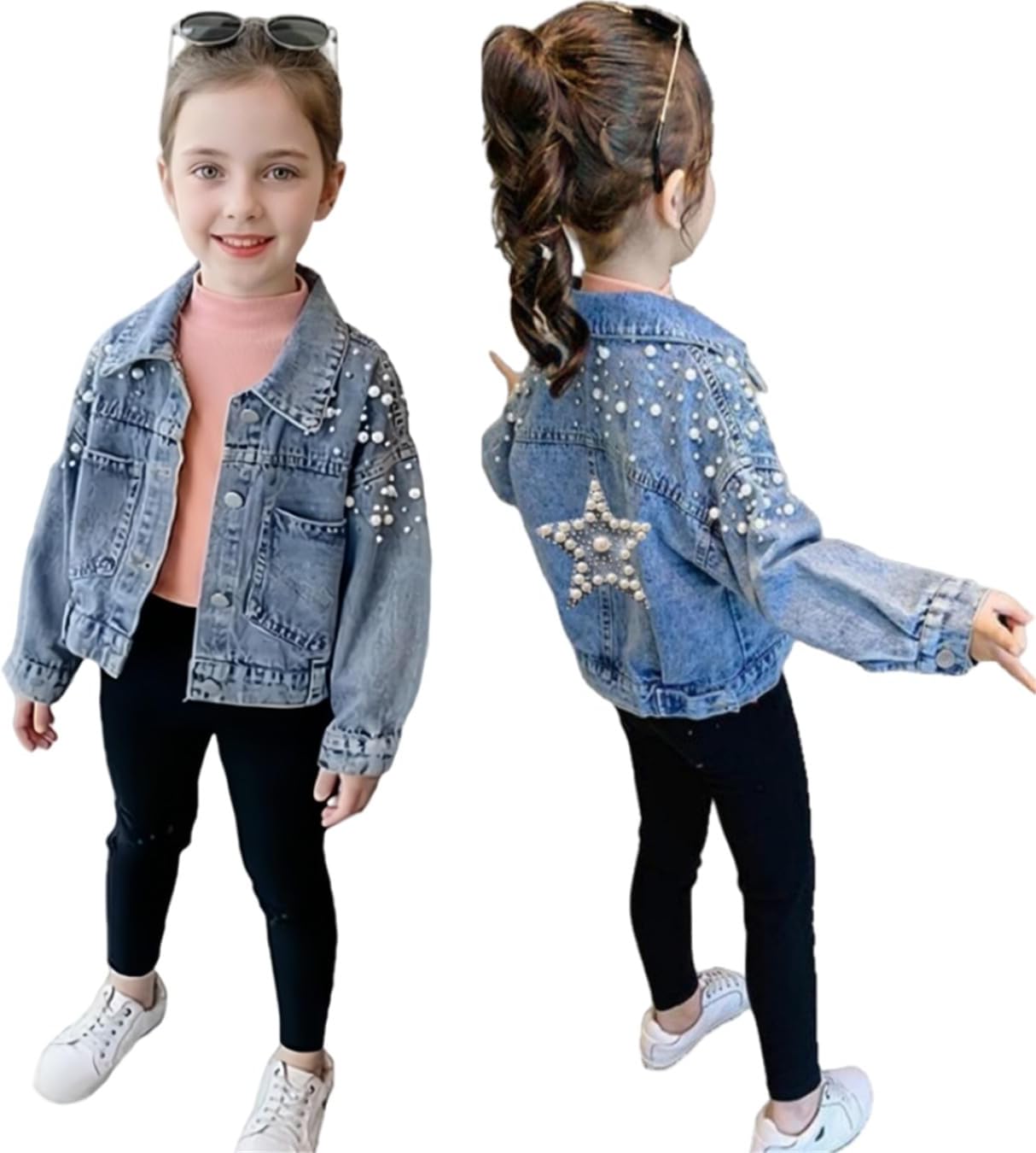 Girls' Classic Pearls Denim Jackets Kids Button Down Jeans Jacket Top Coat Outwear