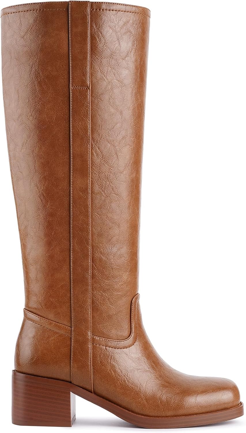 Gothictor Women's Brown Knee High Boots Square Toe Chunky Block Heel Comfortable Low Heel Pull on Wide Calf Riding Boot for Women Saddle Brown 7.5