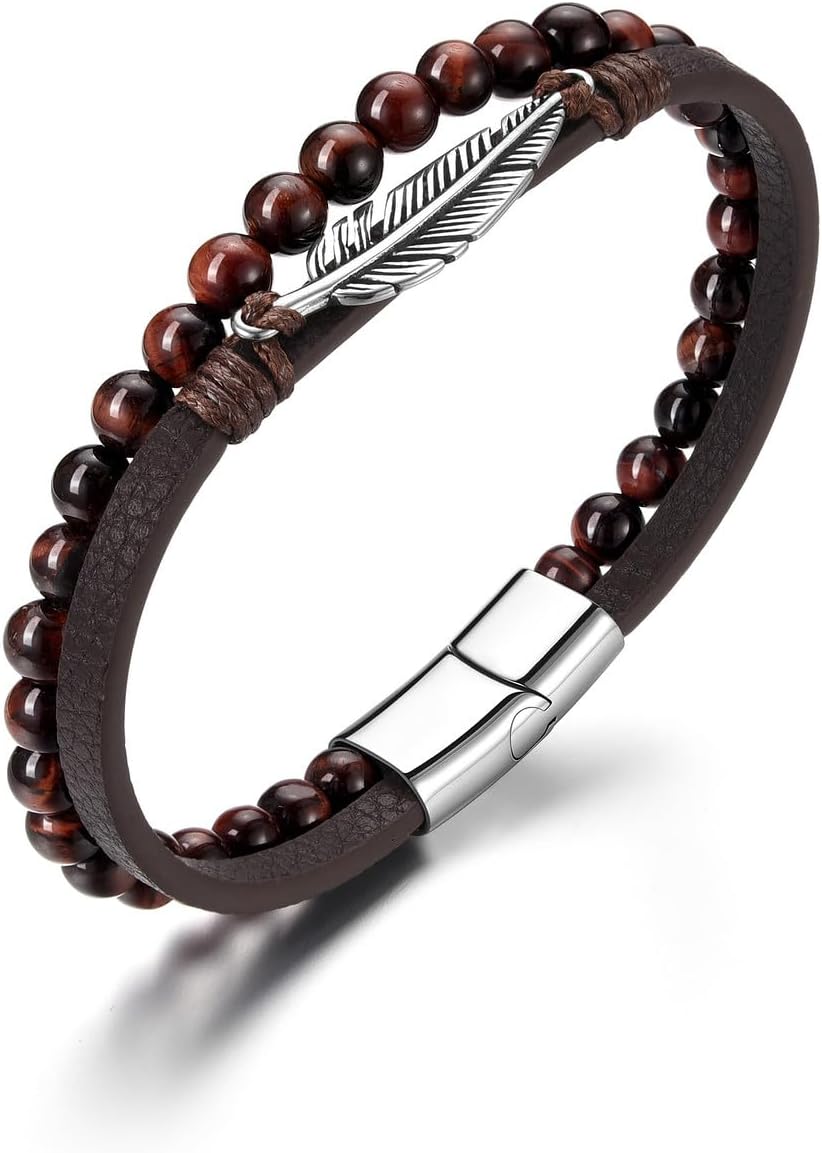 Zysta Leather Bracelet for Men Double Layered Genuine Leather Beaded Bracelet Tiger Eye Lava Rock Stone Braided Leather Cuff Bracelet with Stainless Steel Clasp Mens Wristband Bangle