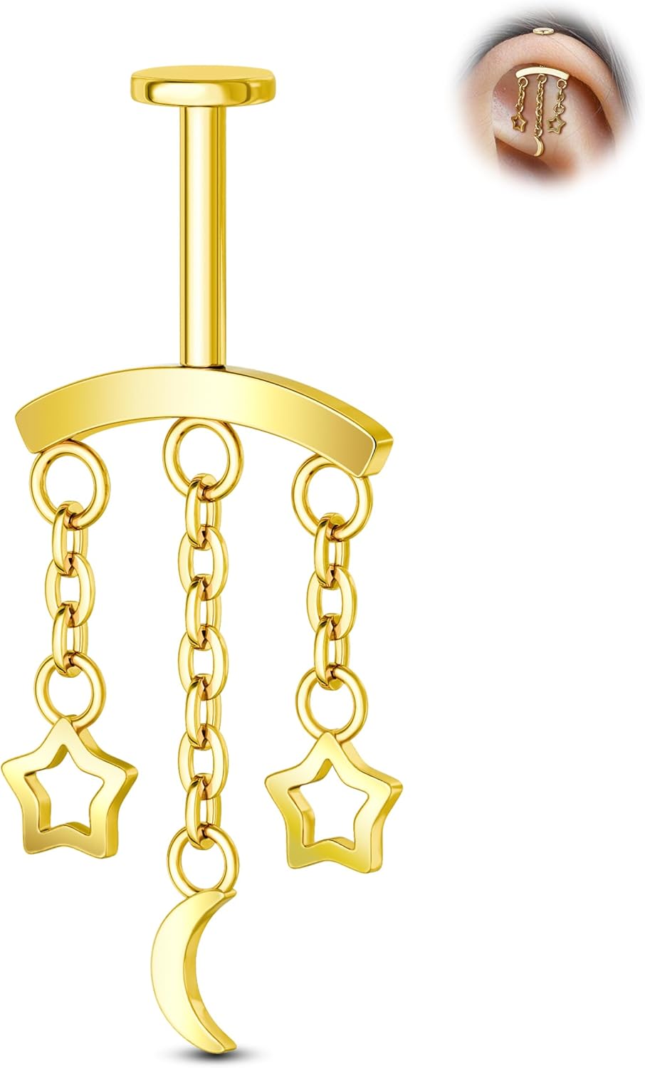 Crescent Moon Star Chain Vertical Hidden Helix Stud Earrings Dangle 316L Stainless Steel Flat Back Threadless Push-Pin Cartilage Rook Piercing Jewelry