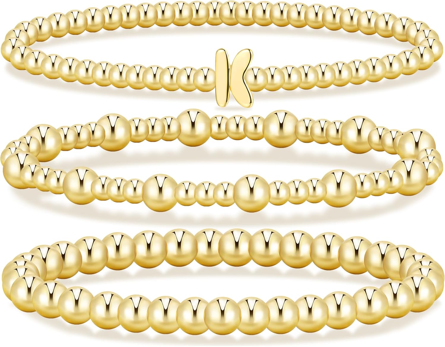 Gold Initial Bracelets for Women, 14K Gold Plated Beaded Bracelets Gold Stretch Bead Ball Bracelet stack Set Adjustable Bracelet Set Jewelry
