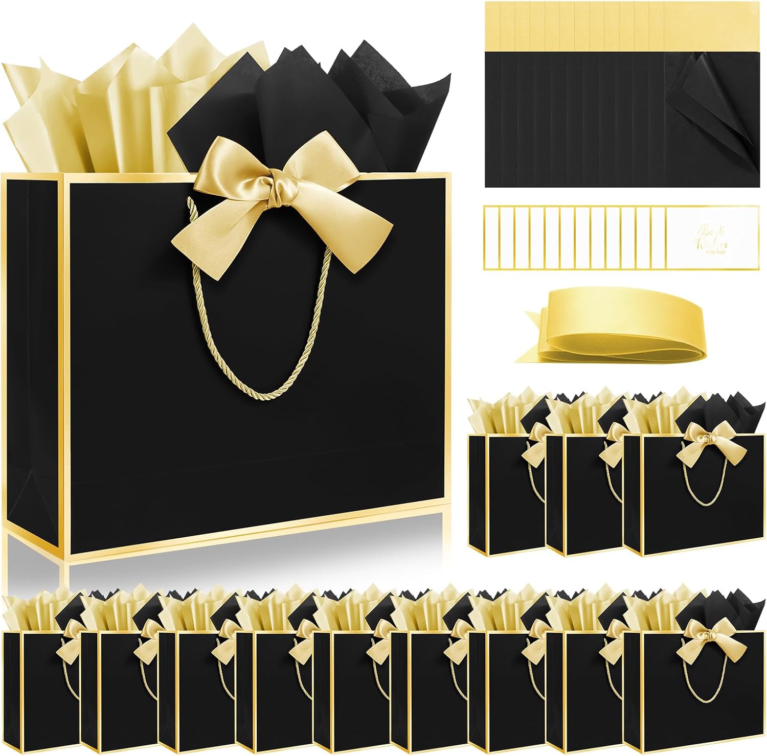 Ethhqu 12 Pack Black and Gold Gift Bags with Handles Include Tissue Papers & Cards, Medium Size 12.6×10×4'' Thank You Gift Bags for Birthday, Weddings, Groomsmen, Valentines, Business Gatherings