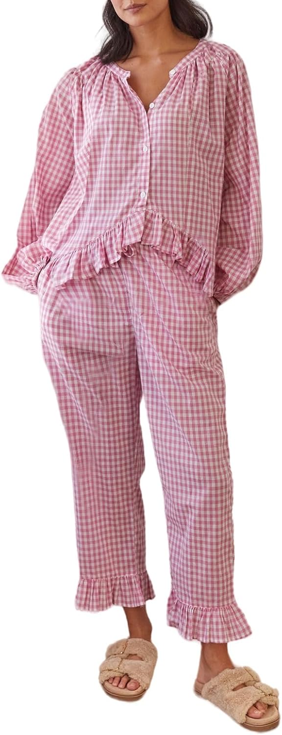 Argeousgor Women 2 Piece Plaid Pajamas Set Y2k Puff Sleeve Peplum Babydoll Shirt Ruffle Hem Pants Gingham Lounge Set