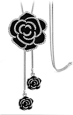 Vintage Black Enamel CZ Rose Flower Pendant Long Lariat Y Necklace for Women Crystal Fashion Statement Tassel Drop Elegant Sweater Adjustable Snake Chain Wedding Jewelry for Her 33''