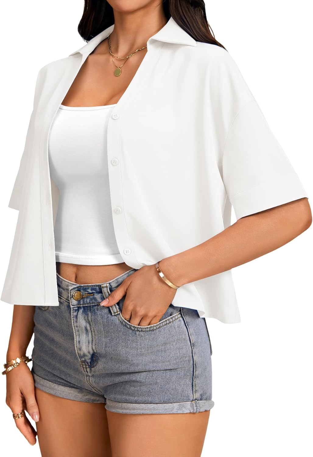 Rooscier Women's Collared Neck Button Drop Shoulder Half Sleeve Office Blouse Top