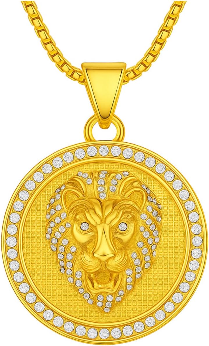 Fanshu Lions Necklace, Stainless Steel Titanium Gold Plated Iced Out Luxury Hip Hop Punk Lion King Head Charm Pendant Collar Chains Necklace for Men Women Couple Gift Fashion Jewelry