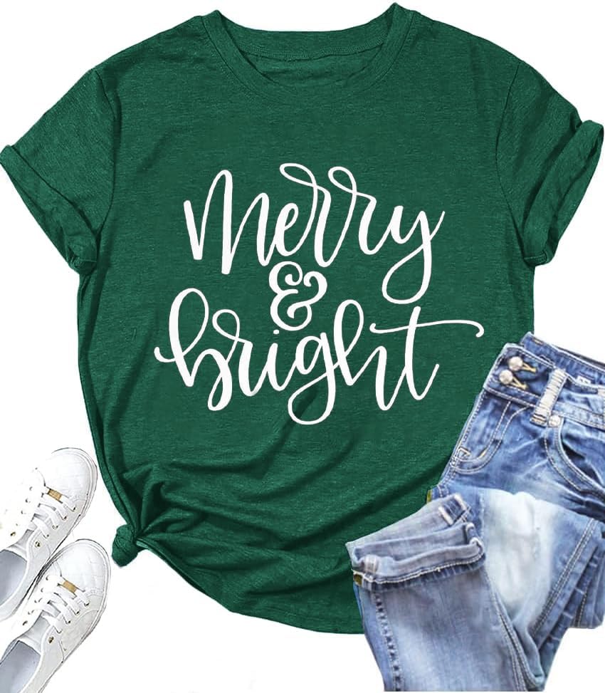 Womens Christmas Shirt Merry and Bright Shirts Xmas Holiday T-shirt Christmas Tee Tops