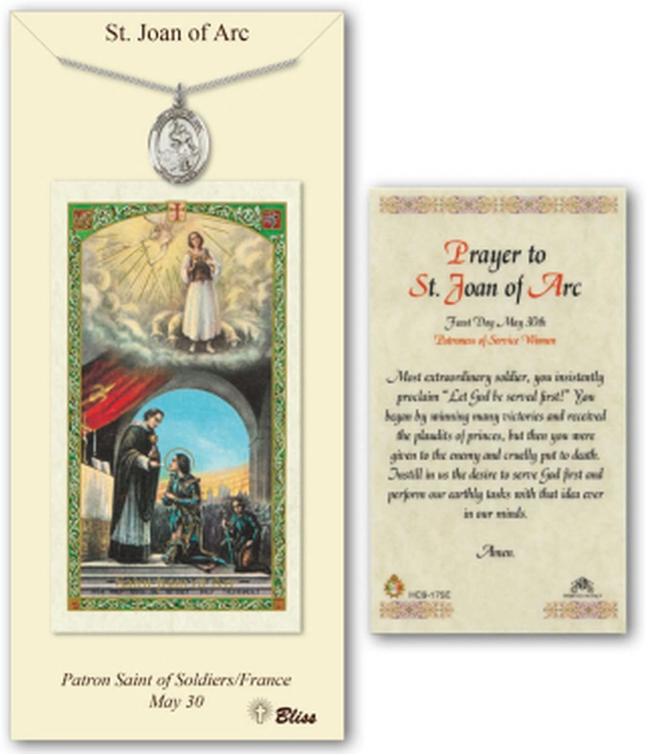 Pewter St. Saint Joan of Arc Medal Pendant Necklace on an 18in Stainless Silver Lite Curb Chain with a Prayer to St Joan of Arc Prayer Card
