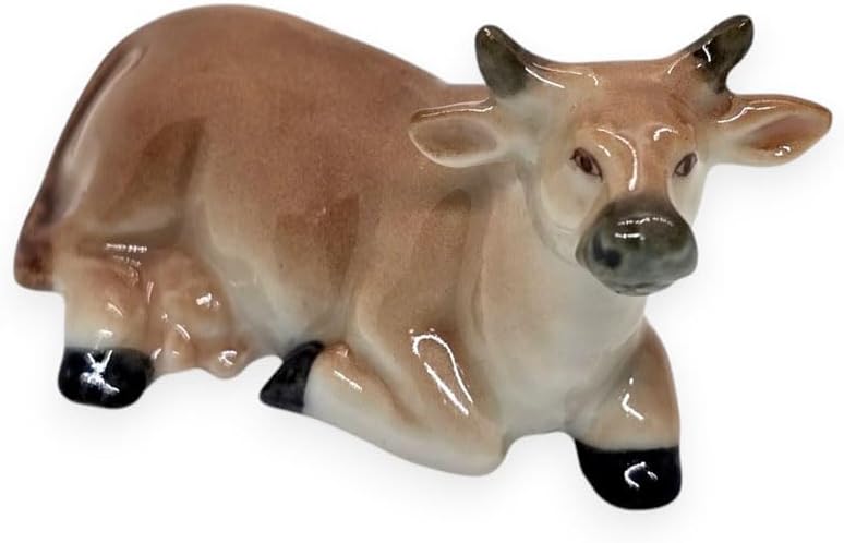 WitnyStore 2¼" Brown Lying Down Cow Bull Ox Ceramic Figurine Terrarium Decoration Collectible Statue for Adult Collectors Handcrafted Porcelain Ornament Sculpture Home Room Tabletop Decor