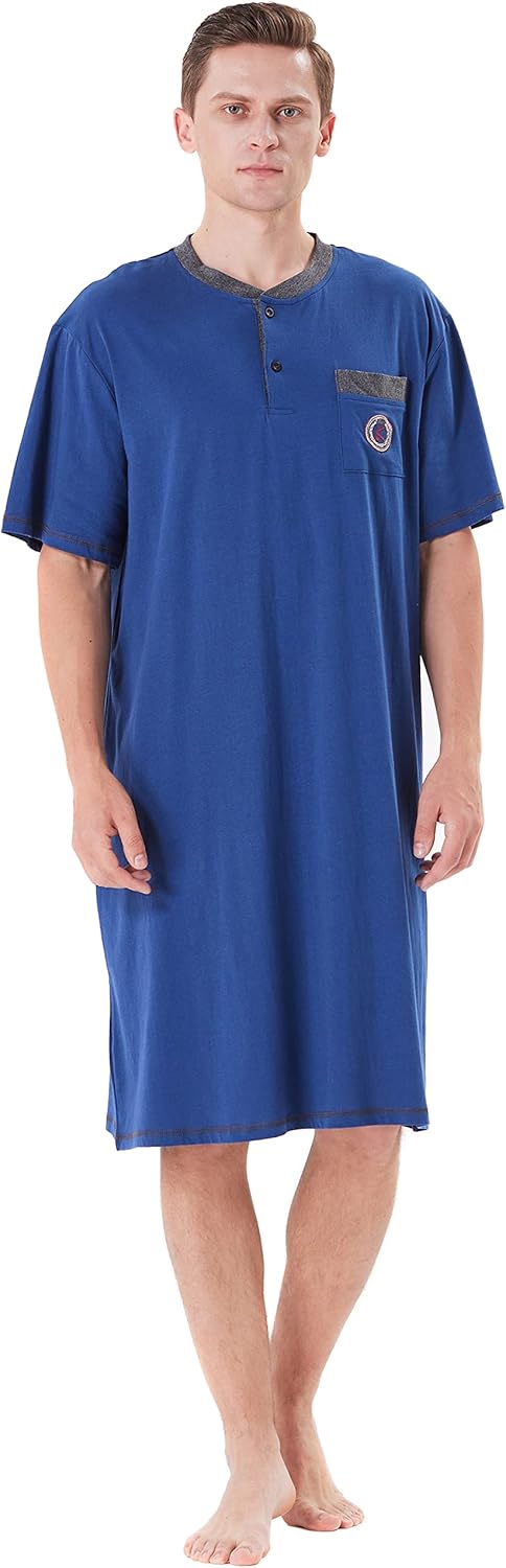 Keyocean Men Nightshirt, 100% Cotton Soft Comfy Short Sleeves Henley Neck Sleeping Loungewear