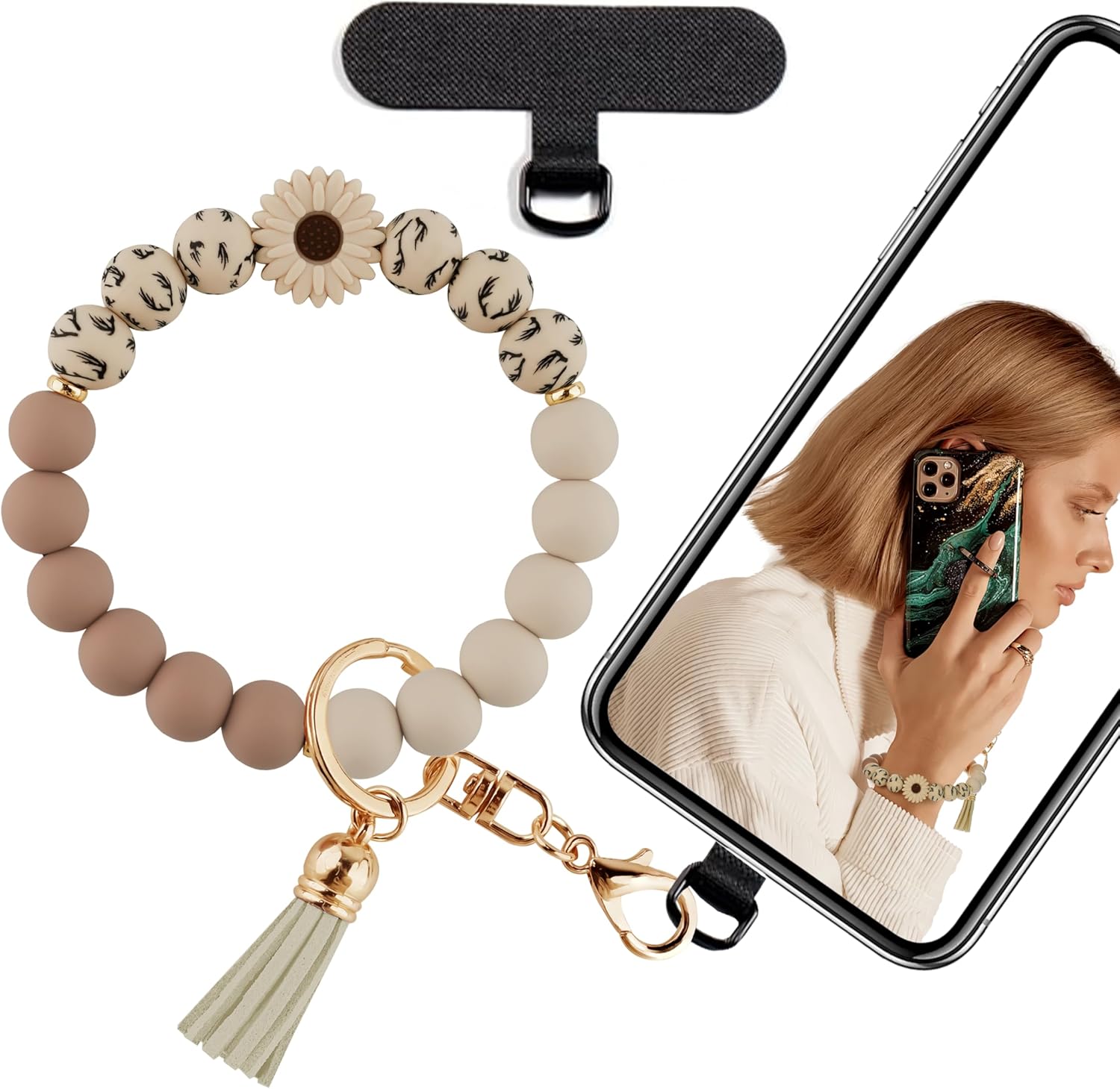 Silicone Beaded Phone Wrist Strap, Phone Bracelet Wristlet with Tether Tab, Hands-Free Wristlet for iPhone (Khaki Daisy)