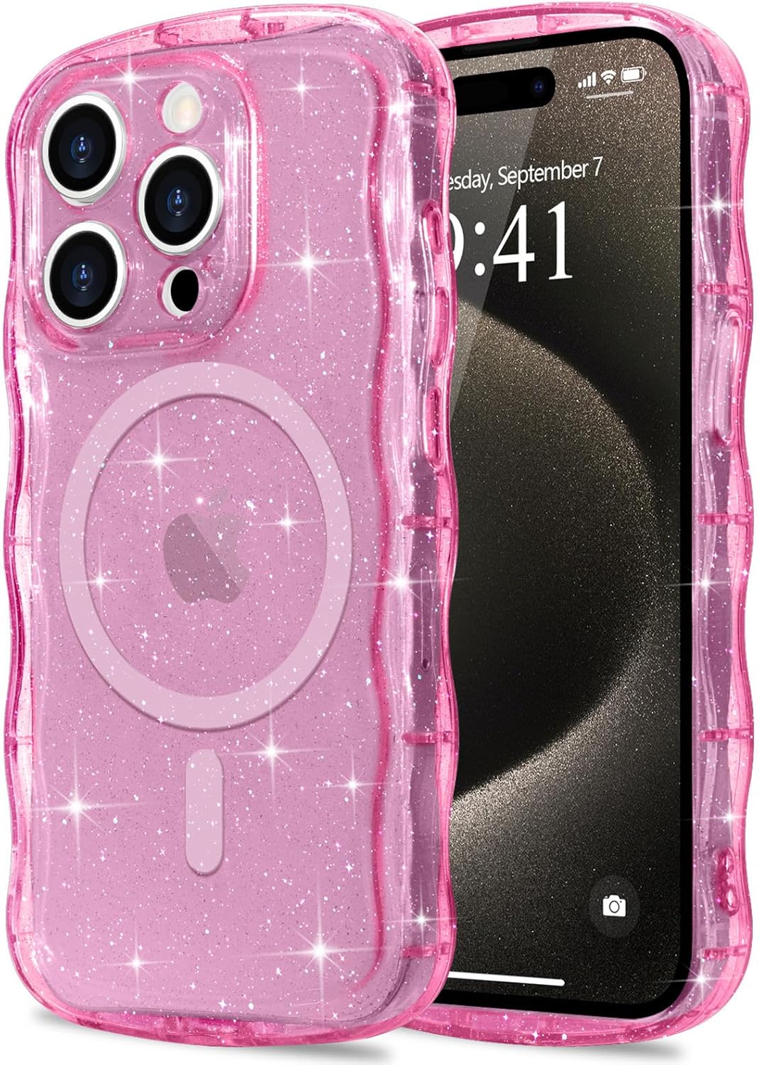 Magnetic for iPhone 15 Pro Max Case Clear, Sparkly Bling Glitter Cute Curly Wave Bumper Cover for Women Girls Compatible with MagSafe TPU Shockproof Phone Case for iPhone 15 Pro Max, Hot Pink