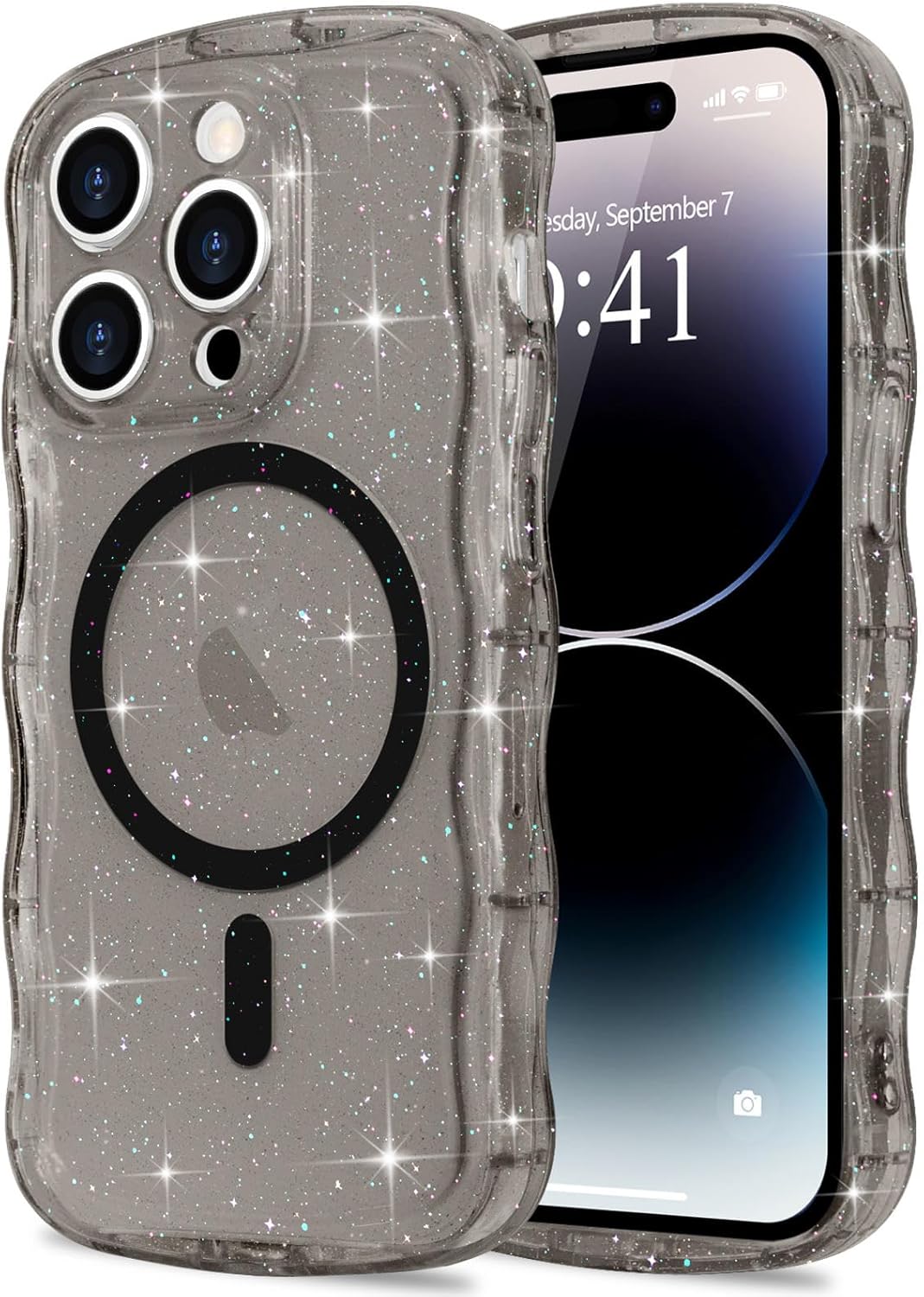 Magnetic for iPhone 14 Pro Max Case Clear, Sparkly Bling Glitter Cute Curly Wavy Cover for Women Men Compatible with MagSafe TPU Shockproof Protective Phone Case for iPhone 14 Pro Max, Black