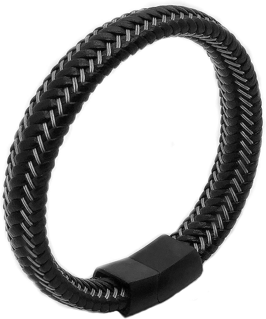Leather Interwoven with Stainless Steel Cable Braided Bangle Bracelet Mens Womens Minimalist