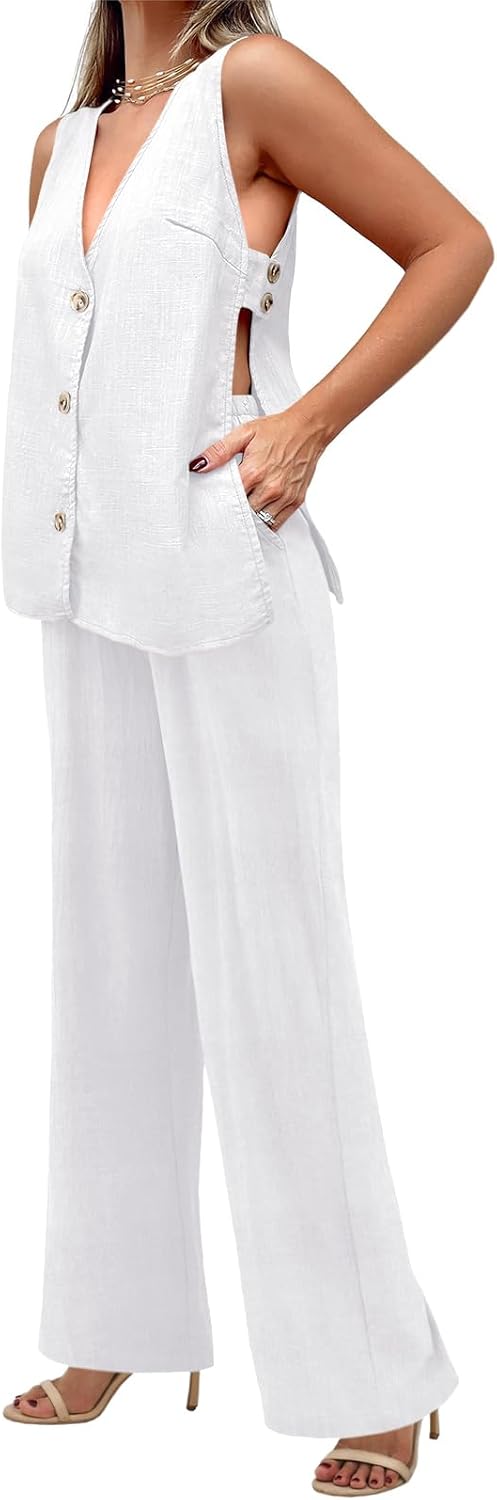 Tankaneo Womens 2 Piece Linen Sets Summer Outfits Sleeveless V Neck Botton Down Tank Tops and Pants Matching Set
