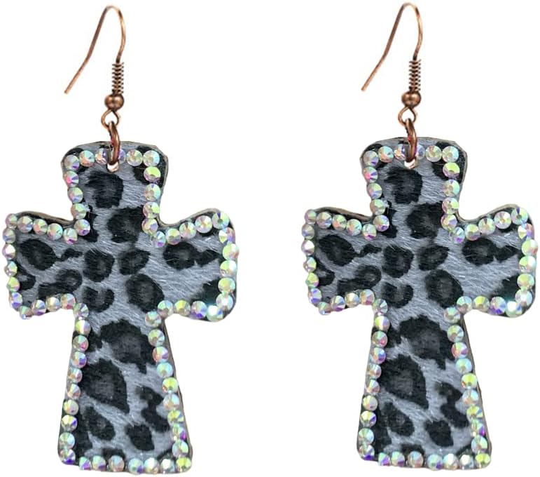 Vintage Leather Cross Dangle Earrings for Women Girls Leopard Print AB Crystal Statement Drop Dangling Hook Stud Earring Boho Lightweight Exaggerated Jewelry (Black)