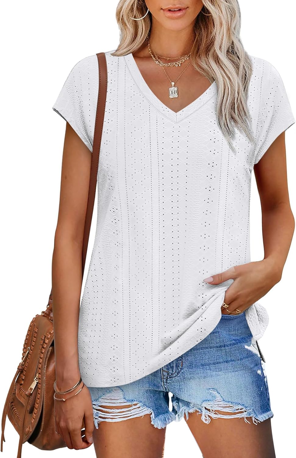XIEERDUO Womens Tops V Neck Cap Sleeve Loose Fit Tee Shirts Summer Spring 2025 Eyelet/Printed