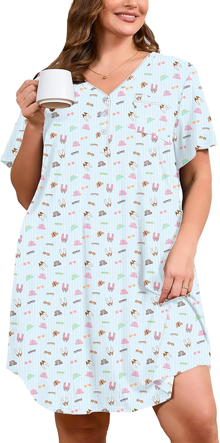 AusLook Plus Nightgowns for Women Short Sleeve Button Down V Neck House T-shirt Dress Loose Maternity Nightshirt Pajamas1-5X