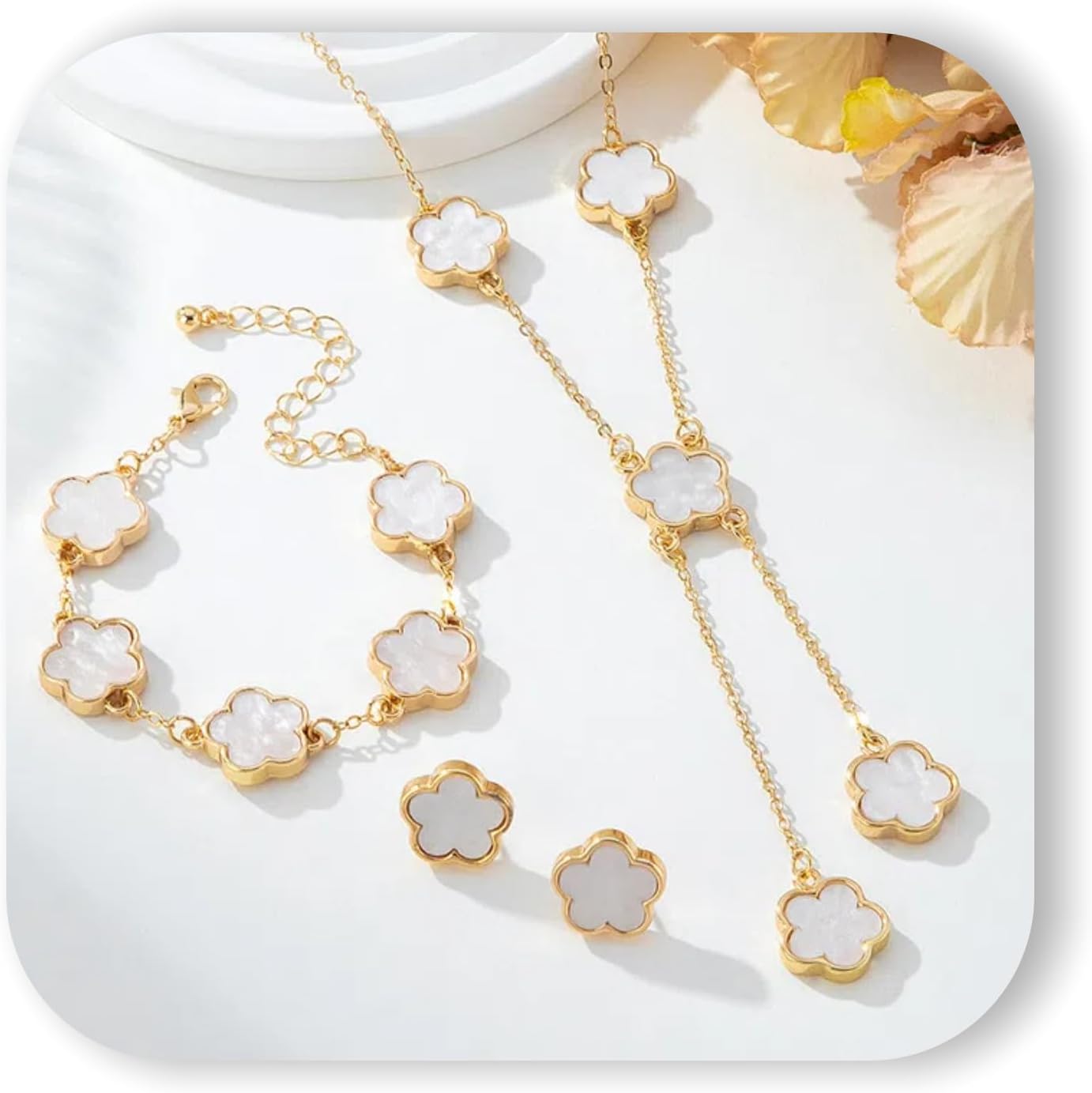 Srazeyo 5 Leaf Flower Jewelry Set Women 5 Leaf Earrings Bracelet Necklace 5 Leaf Clover Plum Blossom Necklace Earrings Three Pieces Ladies Lucky Jewelry Gifts
