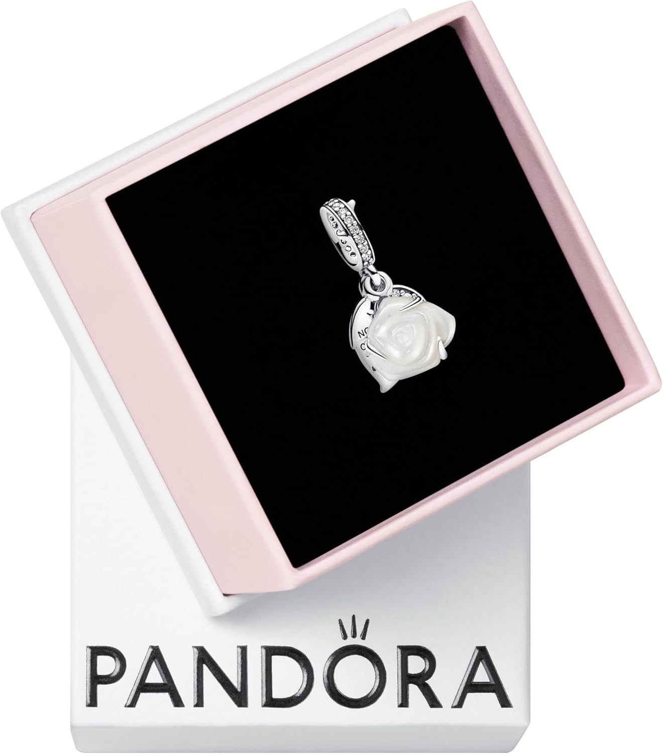 PANDORA Moments White Rose in Bloom Double Dangle Charm - Sterling Silver Charm with Bioresin Man-Made Mother of Pearl & Cubic Zirconia - Jewelry for Women - Includes Gift Box