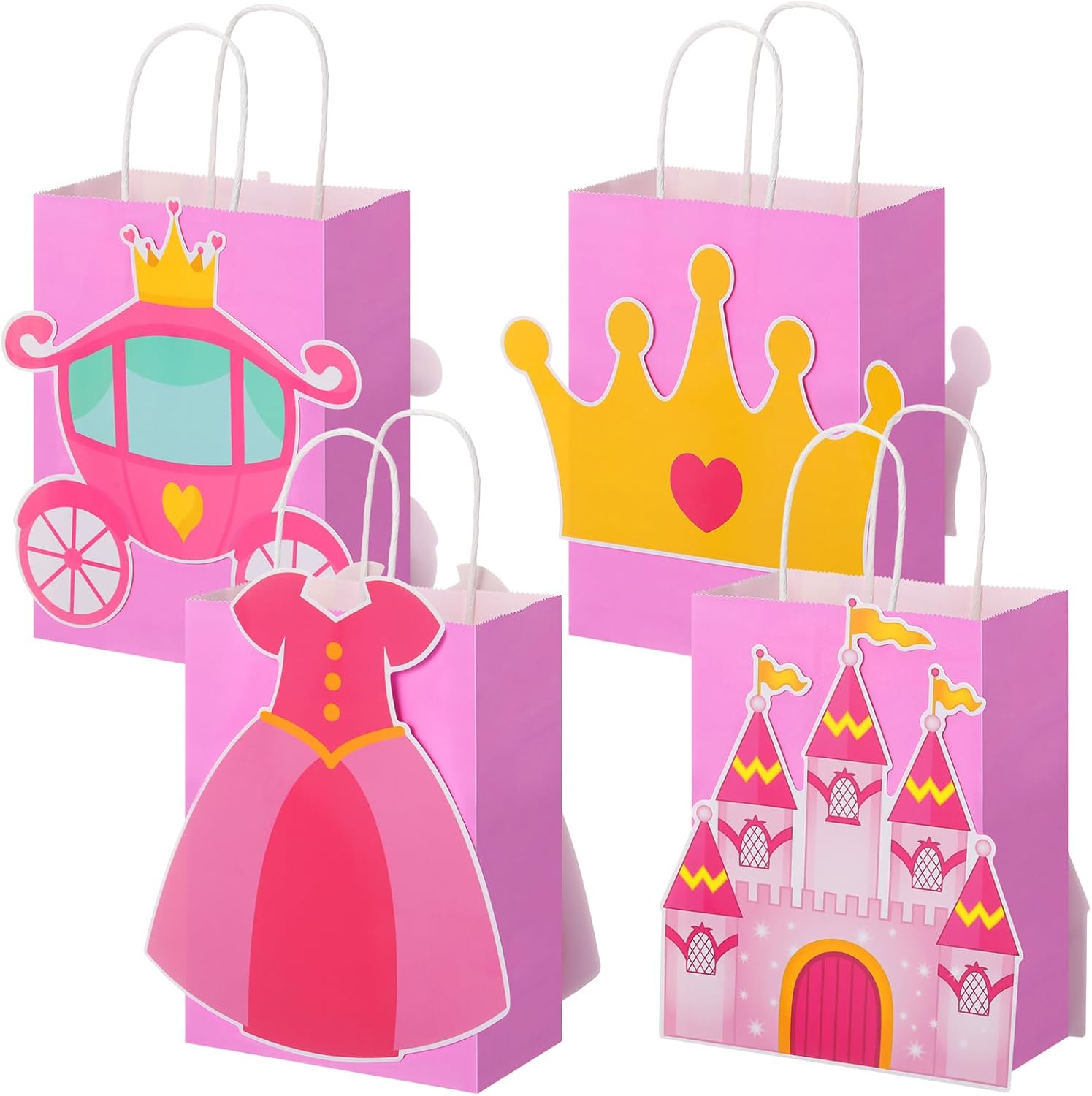 - Sweet Princess Theme Party Design: our princess theme party favor bags are designed with 4 patterns of pink castle, crown, carriage and princess dress; With the pink bag, it will be a match that princess lovers will love; The princess party supplies bags can be matched with your other princess birthday party decorations
