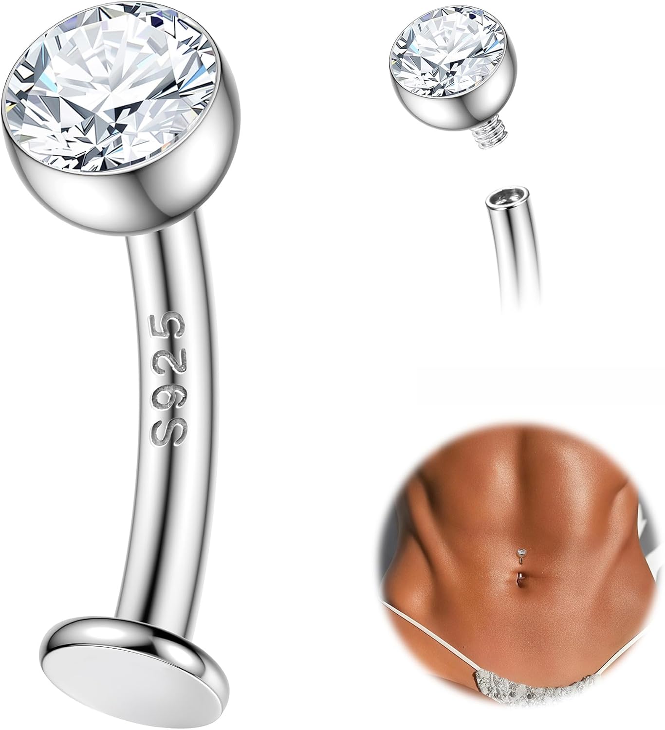 MILACOLATO 14G Solid 925 Sterling Silver Floating Belly Button Rings, Internally Threaded Round CZ Opal Navel Rings Reverse Curved 10mm/12mm Flat Back Belly Piercing Jewelry for Women