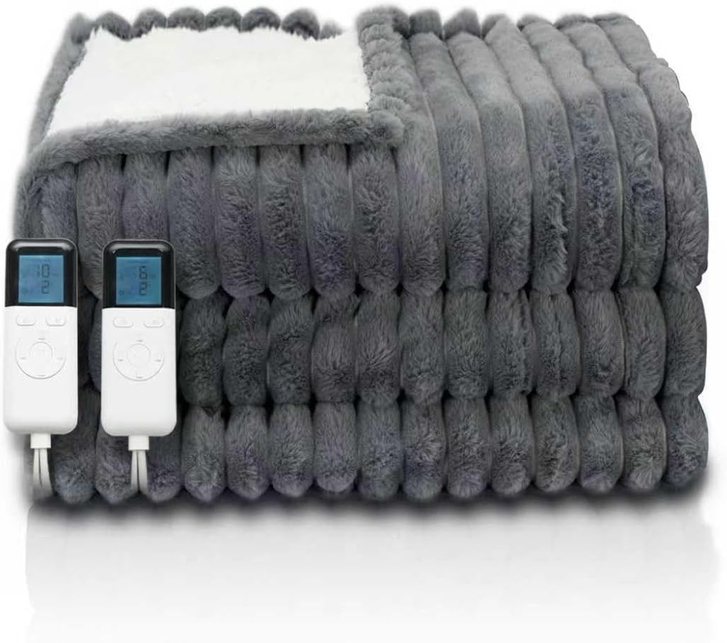 - Premium Dual-Sided Fabric – This heated blanket queen size is crafted with ultra-soft faux fur on one side and cozy sherpa fleece on the other, delivering luxurious warmth and skin-friendly comfort.
